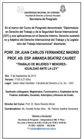 A realizarse el día 5 de septiembre del 2013, en el marco del Curso de Posgrado "Diplomatura en Derecho del Trabajo y de la Seguridad Internacional y sus aplicaciones en el derecho interno. Derecho sustantivo y Adjetivo del del Derecho Internacional del Trabajo y la Legislación del Trabajo Internacional".Informes e inscripción: cgradua@derecho.unc.edu.ar